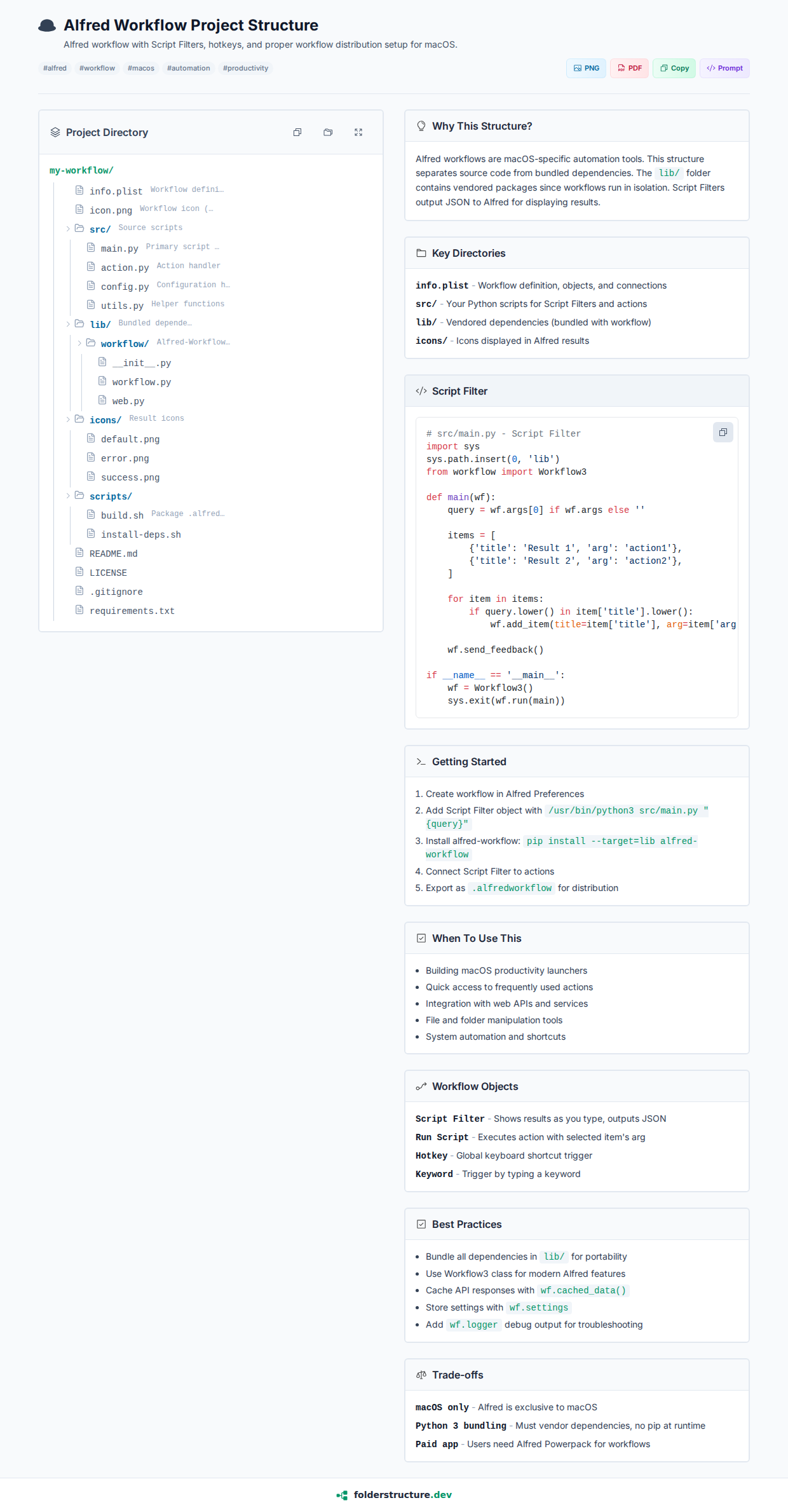 Alfred workflows are macOS-specific automation tools. This structure separates source code from bundled dependencies. The lib/ folder contains vendored packages since workflows run in isolation. Script Filters output JSON to Alfred for displaying results.