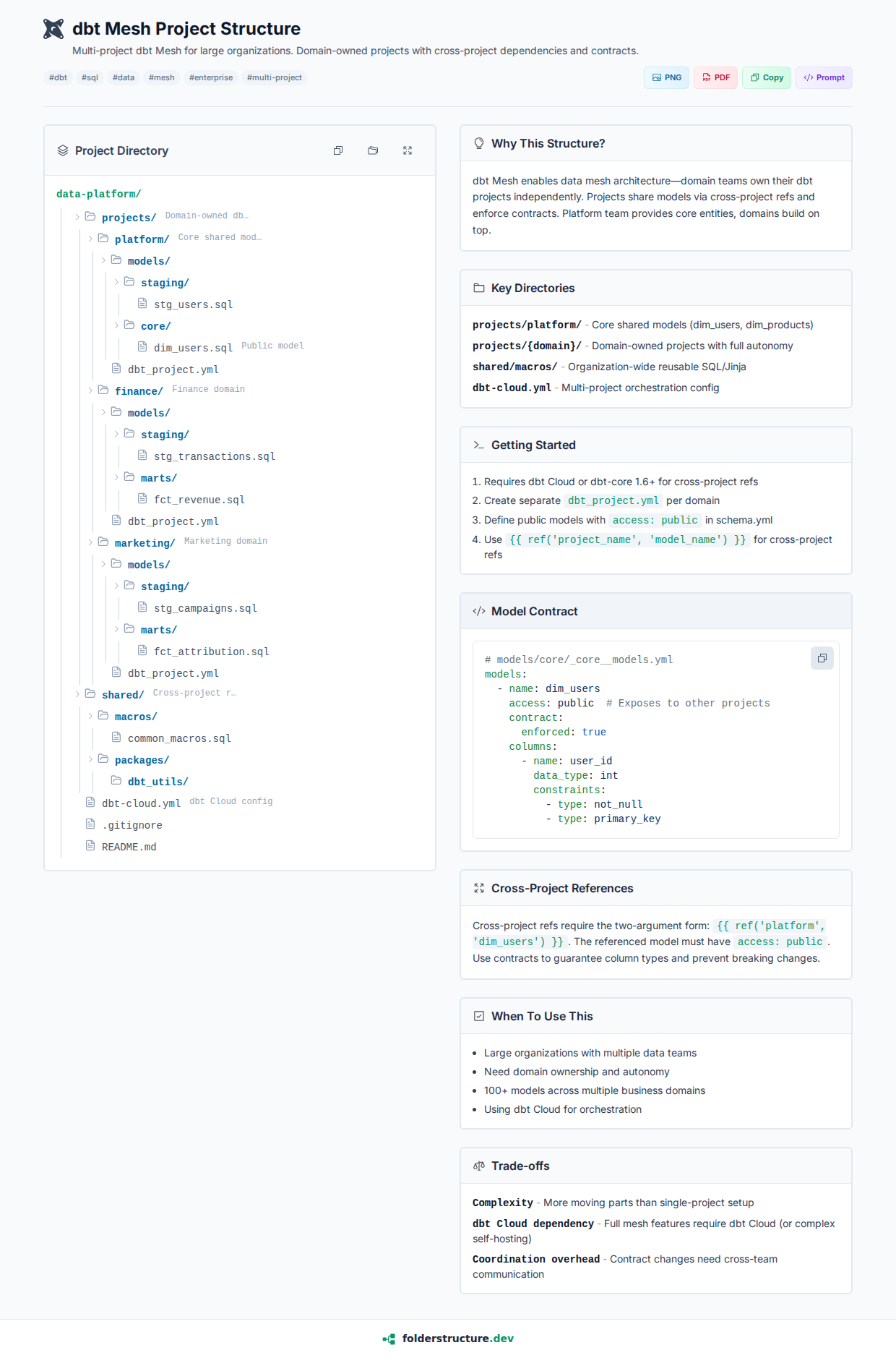 Multi-project dbt Mesh for large organizations. Domain-owned projects with cross-project dependencies and contracts.