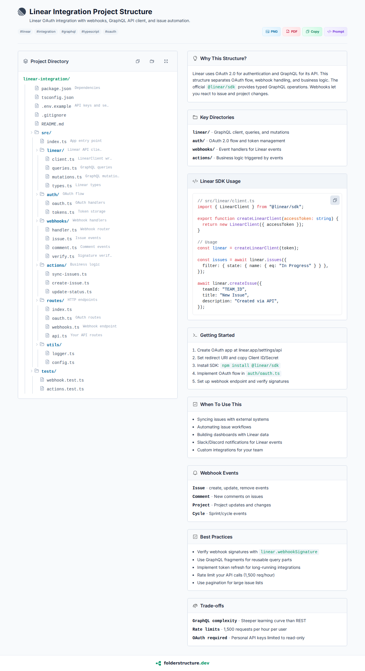 Linear uses OAuth 2.0 for authentication and GraphQL for its API. This structure separates OAuth flow, webhook handling, and business logic. The official @linear/sdk provides typed GraphQL operations. Webhooks let you react to issue and project changes.