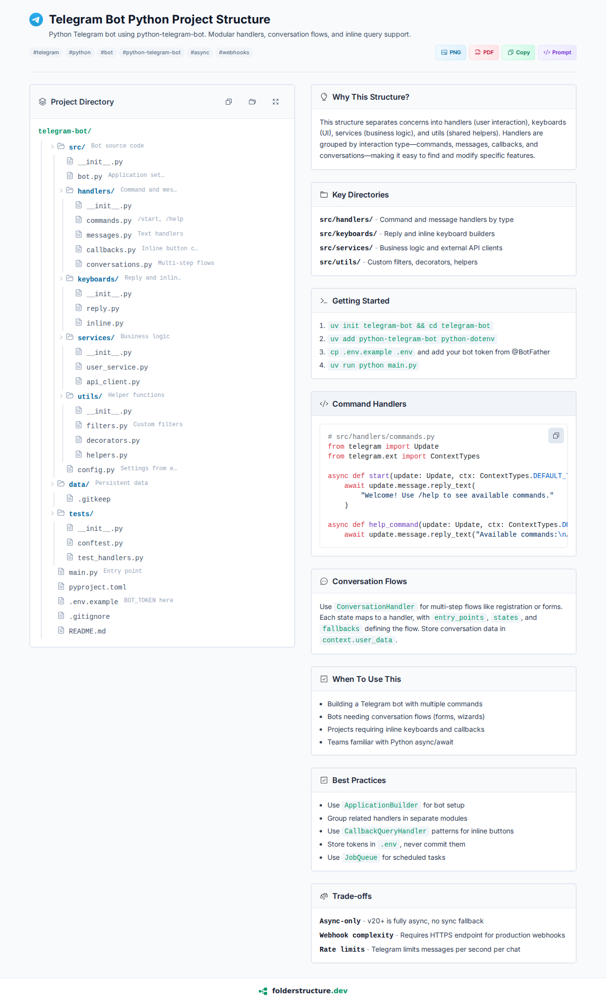 This structure separates concerns into handlers (user interaction), keyboards (UI), services (business logic), and utils (shared helpers). Handlers are grouped by interaction type—commands, messages, callbacks, and conversations—making it easy to find and modify specific features.
